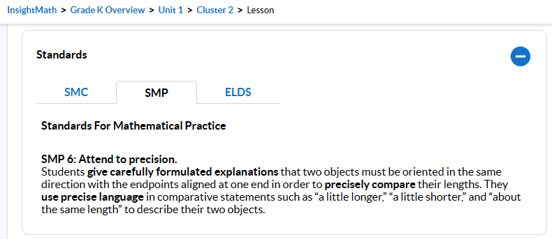 Unit-Level Synthesis: Every unit contains comprehensive descriptions of how each SMP appears throughout the unit's progression. Since students at every grade level use all SMPs in their mathematical work, these descriptions provide teachers support in recognizing these standards across different contexts.