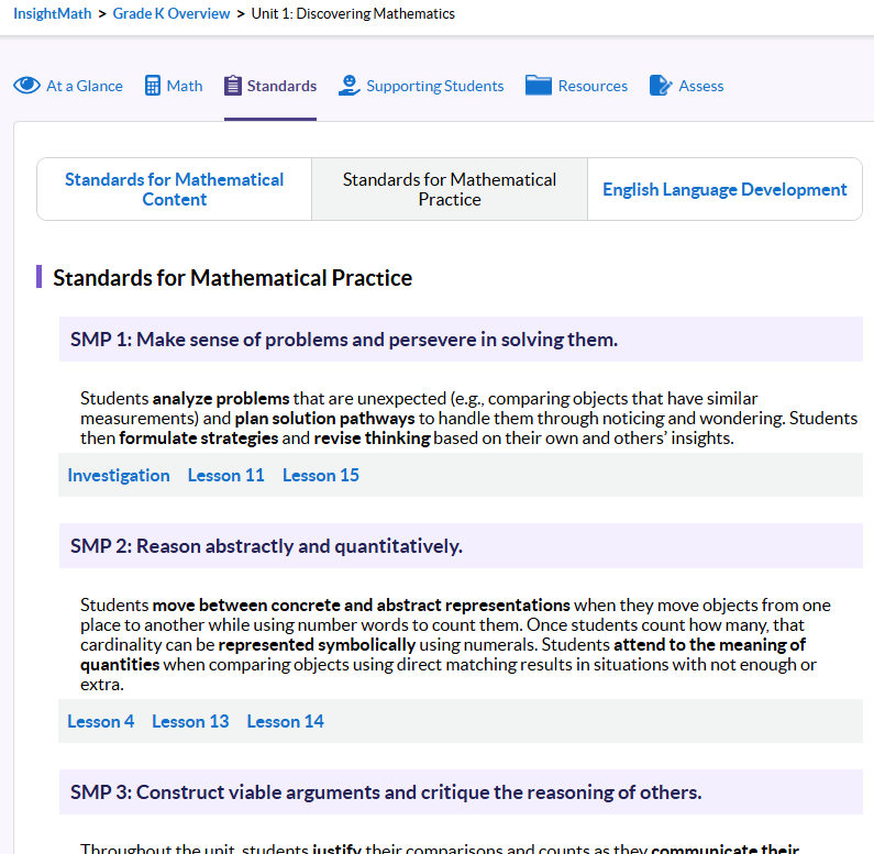The Standards for Mathematical Practice (SMPs) outline key mindsets for engaging with mathematics, as well as the types of learning opportunities that students need to encounter to internalize these practices. InsightMath has been intentionally designed to not only incorporate the SMPs into daily lessons, but to create meaningful connections within and across grade levels, ensuring students develop as confident, capable mathematicians throughout their elementary journey.