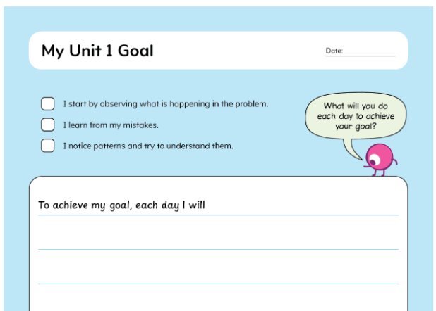 The Goal Pages support students in actively thinking about and internalizing the Student Strengths. At the beginning of each unit, students select from among a few Student Strengths and choose one to focus on throughout that unit. In grades K-1, students choose a goal as a class, then midway through grade 2 they transition to choosing individual goals. At the beginning of the unit, students make a plan for achieving their goal, then check in on their progress at the middle and end of the unit, developing metacognitive skills for noticing their own thinking alongside their growth with the SMPs themselves.