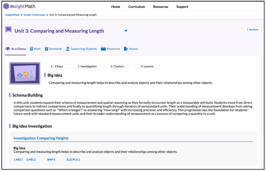 Step 1 - Preview a unit From the At a Glance tab, scroll down to view the unit’s big idea, investigation, clusters, and lessons. |