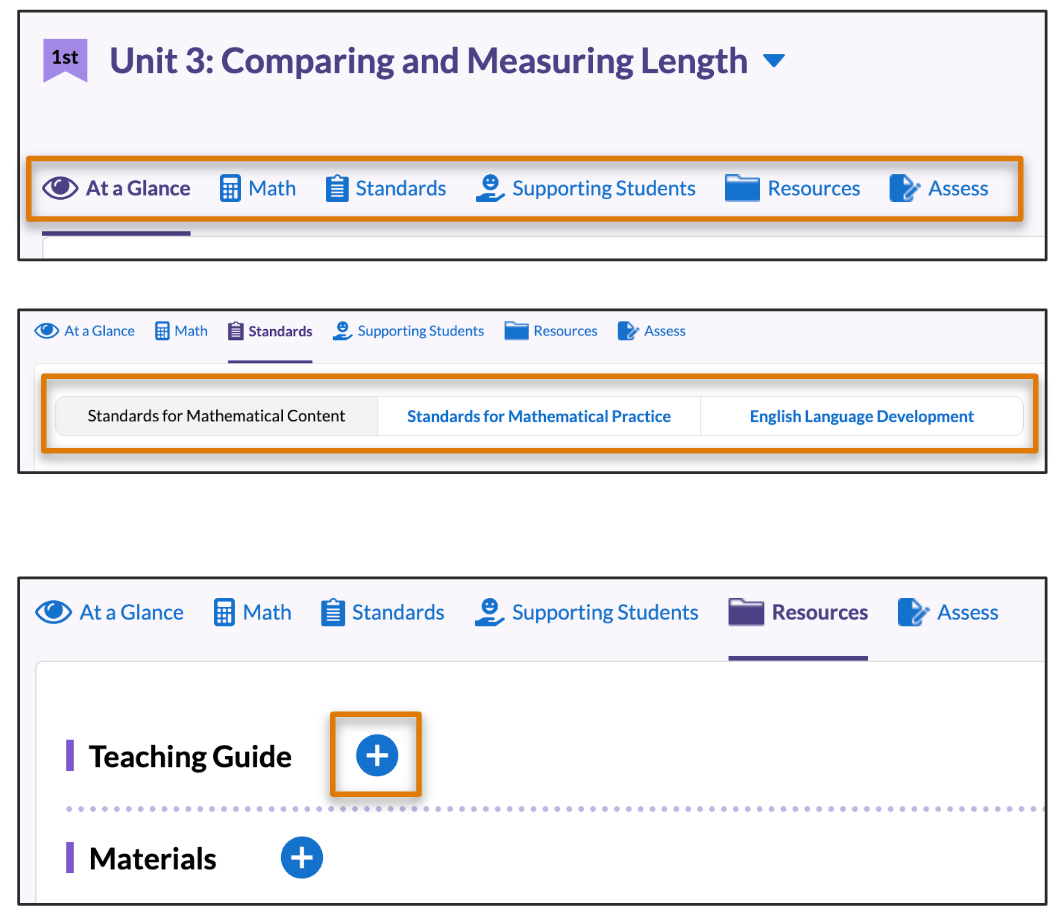 Step 2 - View unit Details Click the tabs across the top to navigate to the math, standards, support strategies, resources, and assessments for the unit. Some tabs contain subtabs to support navigation of standard or assessment types. On the Resources tab, click the plus sign to see all resources of a given type. |