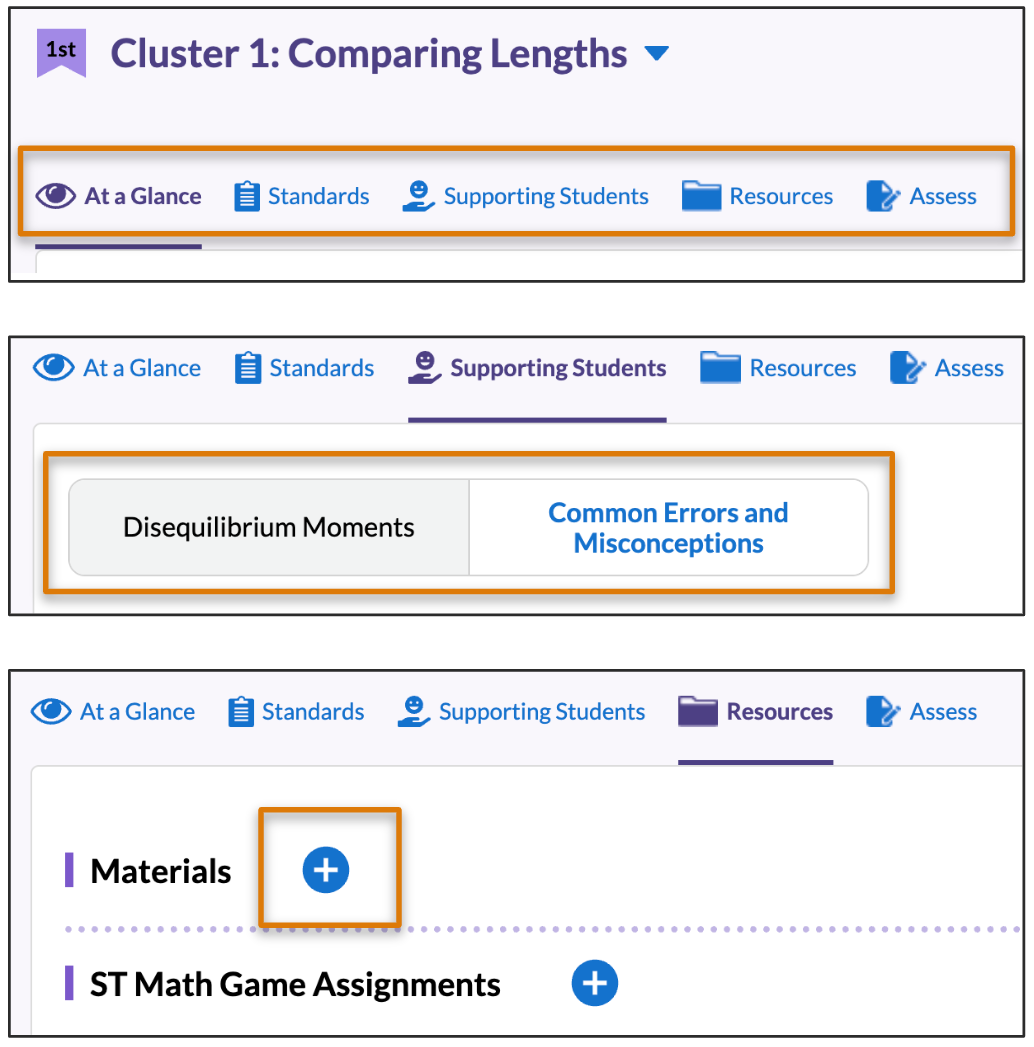 Step 3 - View cluster details Click the tabs across the top to navigate to the standards, support strategies, resources, and formative assessment opportunities. The Standards and Supporting Students tabs contain subtabs. Click these to view standards by type, note disequilibrium moments, or identify common errors and misconceptions within the cluster. On the Resources tab, click the plus sign to see all resources of a given type. |