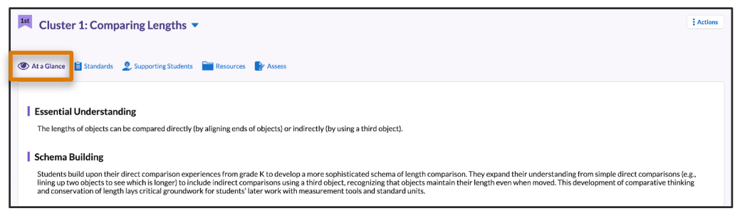 Step 2 - Preview a Cluster From the At a Glance tab, scroll down to view the cluster’s essential understandings, outcomes, vocabulary, and lessons. |