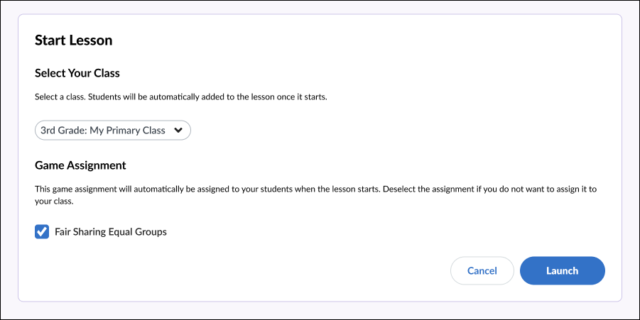A screen will display asking teachers to select a class for the lesson and select whether the lesson’s associated game assignment should be assigned to these students.